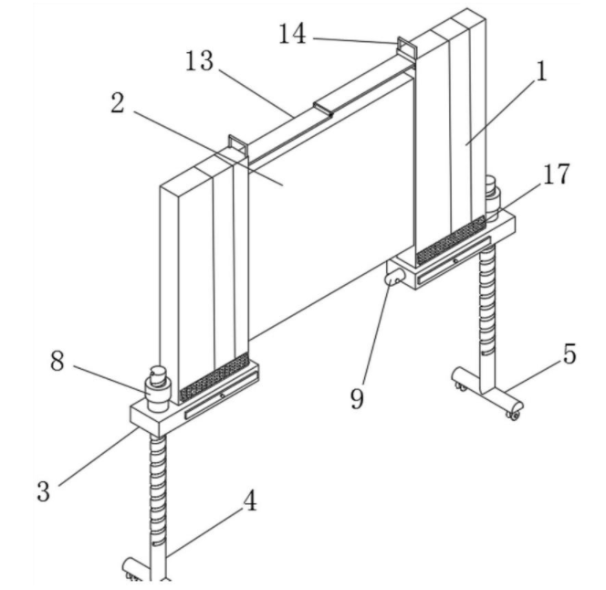 本发明涉及多媒体教学设备技术领域的一种学校用智能化多媒体教学设备,包括收纳粉笔板,所述收纳粉笔板的内表面活动连接有电子屏,所述收纳粉笔板的下表面固定连接有支撑板,所述支撑板的上表面固定连接有连接套,所述连接套的一端固定连接有限位环,所述限位环的外表面活动连接有螺纹套,所述螺纹套的内表面螺纹连接有支撑杆,所述支撑杆的下端固定连接有横杆,所述横杆的内表面活动连接有限位块,所述限位块的下端固定连接有万向轮,所述收纳粉笔板的上表面固定连接有握把;装置使用过程中可以在限位板以及其一端挡块的限制下直接拉伸展开,使用完毕后通过对支撑杆高度的调整以及两个收纳粉笔板的合并,将装置进行折叠收纳,便于对装置的使用。