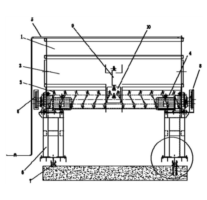本实用新型公开了一种分体式秸秆搅拌机,包括壳体、螺旋体、驱动装置、底座和喷淋装置,所述壳体上设有入料口和出料口,该壳体罩设在螺旋体的上方,所述驱动装置与螺旋体连接并驱动螺旋体转动,所述底座位于螺旋体下方,该底座的底部设有称重装置,所述喷淋装置设置在壳体的顶部并设置喷头。本实用新型具有效率高、混合质量好、卸料时间短、残留量少等特点,可适应稠状、糊状,粉状物料的混合。