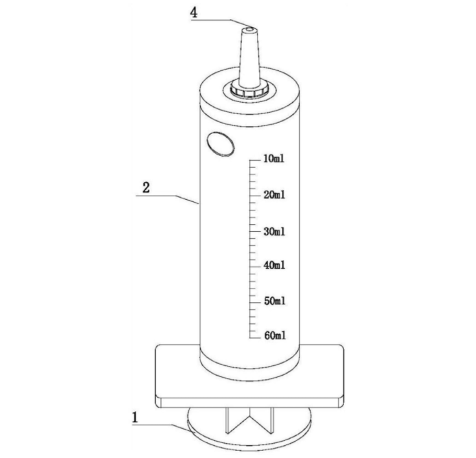 本实用新型提供一种新型针筒式泡沫用量测量装置,属于实验器具技术领域,包括推杆、套筒和密封套,推杆设置在套筒内壁,套筒的侧边设置有灌液口,套筒顶端设置有出液口,密封套与出液口卡接,套筒外壁设置有量程刻度,套筒设置为透明结构。该装置通过套筒上的灌液口灌入泡沫,当泡沫达到套筒上所需量程位置后,再将泡沫从套筒顶端推出,实现了装填一定量泡沫,利用套筒上量程刻度与推杆确保装填泡沫量精度。该装置实现了泡沫用量的简易装填,可在精确取少量泡沫时应用,在确保密封效果好的同时较为精确地量取定量的泡沫,该装置具有便捷,易使用的特点,且不受场地限制,且解决了装取定量发泡机泡沫的需求,可大量用于发泡试验。