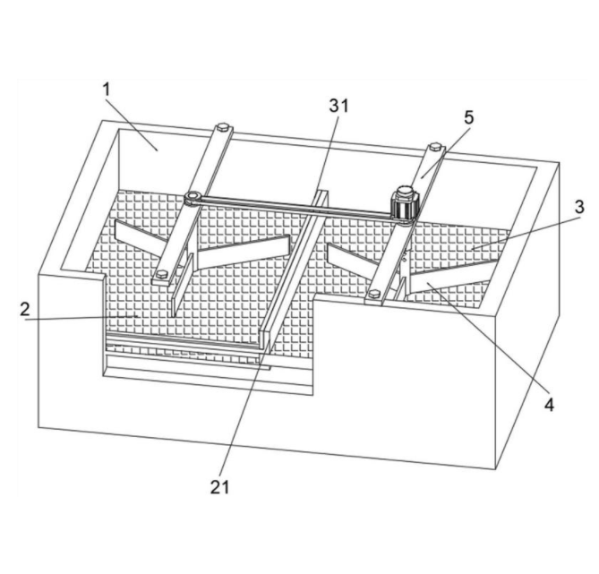 本实用新型涉及汽车加工领域,具体地说,涉及一种汽车加工用污水过滤装置。其包括箱体,箱体的内部设有上滤板,上滤板一侧安装有挡板,上滤板的内侧滑动有下滤板,下滤板的上方设有推板,推板与下滤板之间通过滑块连接,滑块位于上滤板上滑动,箱体的上方设有搅动件,搅动件的表面安装有固定板,固定板与箱体固定连接。通过下滤板沿着上滤板滑动,推板推动上滤板表面的污浊物,并清除至一侧,下滤板在滑动时,且下滤板上的污浊物被挡板推动清除至一侧,上滤板和下滤板的污浊物同步处理,利于污浊物移出,达到便捷的清理上滤板和下滤板上的污浊物。