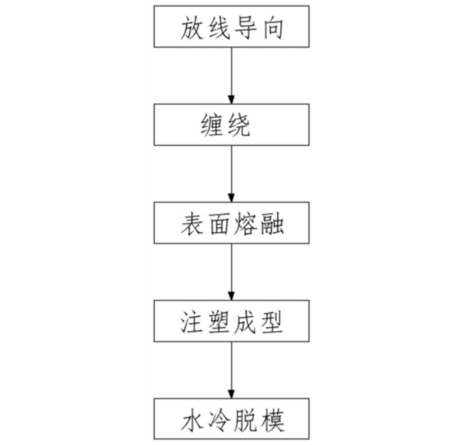 本发明公开了一种PE电熔管件的制备工艺,包括以下步骤:步骤一:放线导向;步骤二:缠绕;步骤三:表面熔融;步骤四:注塑;将外设金属丝的模芯放入注塑机的模具内,启动液压杆,使盖板朝着模具运动,将成型槽进行密封,然后启动注塑机,使注塑管内的熔融流体通过注塑孔进入成型槽内,进行注塑成型,成型后,使盖板向外运动,然后启动冷却箱内的水泵,利用水压的压力将顶盘向外运动,从而使注塑完成的模型与成型槽的自动分离,在顶盘向外运动后,冷却液随着上喷孔和下喷孔喷出,对成型槽的上下在同时进行喷淋冷却降温,步骤五:水冷脱模;这样的设计,能够有效的提高注塑成型的效率,提高整体的产量,而且能够将能源充分利用,降低了成本。