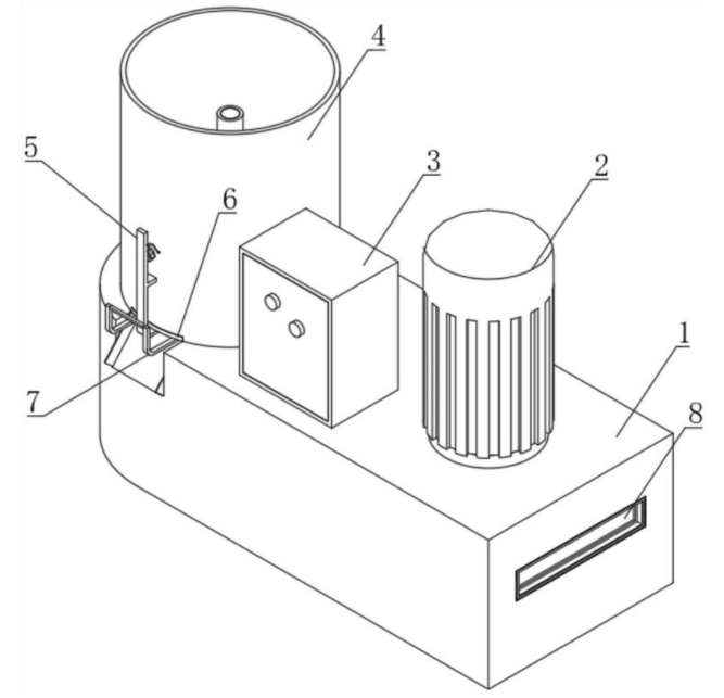 本实用新型公开了一种绝缘生产用的绝缘物料搅拌烘干装置,涉及绝缘物料技术领域,包括搅拌烘干组件,烘干单元包括固定设置在转轴外表面下端的扇叶,底座下底面右侧固定连接有第一连接管,第一连接管的一端设置在扇叶下方,底座内底面中间位置均布排列固定连接有电热丝棒,第一连接管另一端与电热丝连接,最左侧电热丝外侧固定连接有第二连接管,热空气通过喷气管排出,对加热棒进行加热,稍许空气通过喷气口喷出,对绝缘物料进行烘干,操作便捷,烘干全面彻底,通过转轴带动皮带与固定套转动,通过固定套带动第三连接管转动,通过第三连接管带动加热棒转动,通过加热棒上的往复螺纹带动滑块喝搅拌棍进行上下往复运动对绝缘物料进行搅拌。