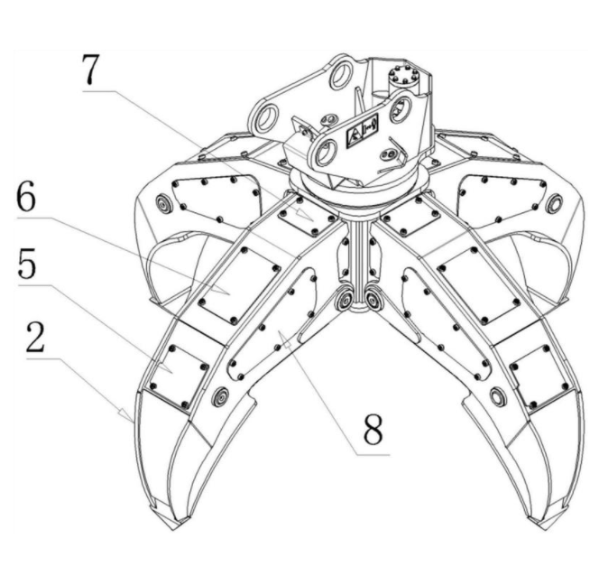 本实用新型公开了一种全防护式多瓣梅花夹,包括马拉头、瓣夹、回转支撑、瓣夹连接座、油缸组件及油缸保护盖,马拉头连接安装在回转支撑上,瓣夹连接座设置于回转支撑的下端,瓣夹连接座上对称设置有多个瓣夹,油缸组件安装在每个瓣夹上,油缸保护盖包括油缸前端保护盖、油缸中段保护盖、油缸尾端保护盖及油缸侧面保护盖,油缸前端保护盖、油缸中段保护盖、油缸尾端保护盖及油缸侧面保护盖分别安装于每个瓣夹上油缸的前端、中段、尾端及侧面。本实用新型对油缸进行全包围式防护,不仅保护了油缸,而且四瓣夹整体强度和刚性都得到提高,使得油缸的安装、液压管路的连接及黄油注入简便、可靠,同时降低了维护成本,满足了特殊工况对产品的要求。