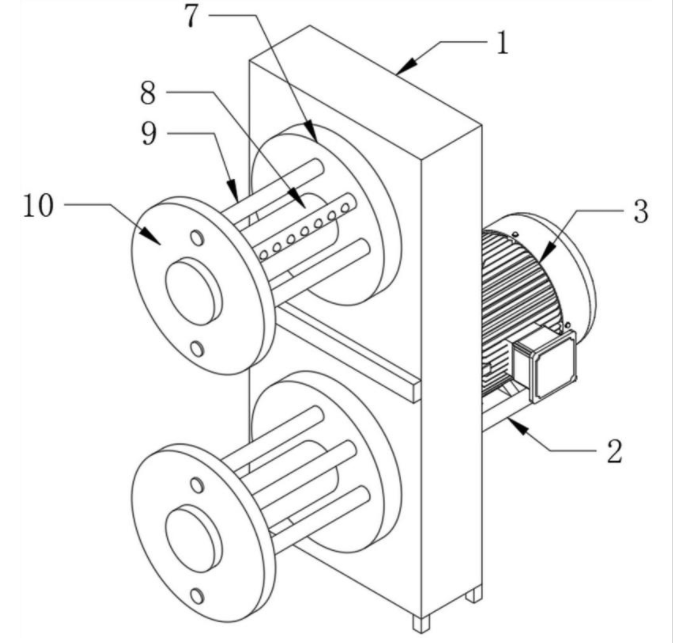 本实用新型涉及电缆技术领域的一种电缆缆芯绕包装置,包括安装板和支撑板,所述安装板的一侧固定连接有所述支撑板,所述安装板的一侧设有两个连接板,所述连接板远离安装板的一侧固定有固定杆,所述固定杆的四周分布有环形状与连接板固定连接的连接杆,所述固定杆的一侧设有挡板,所述固定杆与所述连接杆固定连接有位于挡板内插设的固定板,所述挡板开设有两个呈对称设置的螺纹槽,所述螺纹槽内螺纹连接有限位螺丝。当电缆加工完成时,可通过旋动限位螺丝从螺纹槽内取出,此时限位螺丝将取消对挡板与固定板的限位,随后可手持挡板取消对固定板的套设,此时可手持电缆取下,实现了便于拆装的效果,有利于提高了工作效率。