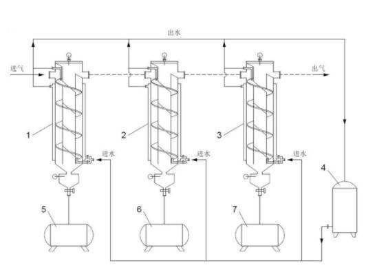 本实用新型公开了一种用于含油污泥热解尾气的多级油气冷凝回收系统,包括若干个依次连通的冷凝器、连接在冷凝器底部的回收油罐和循环水制冷装置,每一个冷凝器包括内筒体、外筒体、夹套、集液装置,内筒体设置在外筒体的内部,且内筒体的下部与外筒体连通,其中外筒体的上部设有进气口,内筒体的上部设有出气口,所述夹套为中空筒套并紧贴固定在外筒体的外侧壁上,该夹套的下部设有进水口且上部设有出水口,所述进水口和出水口分别与循环水制冷装置连通形成制冷系统。该系统使热解尾气以螺旋的方式流动,不断冲刷筒壁,实现自清理的功能,有效解决重质油凝结换热管或堵管现象、传热效率下降的问题。