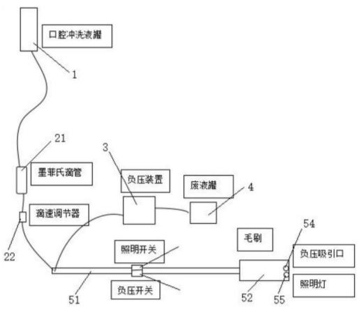 用新型公开了一种可照明的冲洗式可控负压吸引口腔护理冲洗装置,包括口腔冲洗液罐、流速控制器、负压装置、废液罐、口腔毛刷,所述口腔冲洗液罐通过软管连接口腔毛刷,该软管上设置流速控制器,所述废液罐通过管道连通口腔毛刷且该管道上连通负压装置,所述口腔毛刷包括刷柄和毛刷,所述毛刷设置在刷柄的末端,该刷柄内设有两个通道分别连通口腔冲洗液罐和负压装置,所述毛刷上设有出水口、负压吸引口和照明灯,所述出水口分布在毛刷表面,所述负压吸引口和照明灯设置在毛刷的端部,该负压吸引口通过刷柄内的通道连通负压装置。本实用新型具有照明功能,便于清洗口腔,还能够将口腔冲洗液沿着毛刷充分清洗。