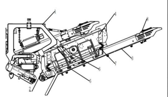 本实用新型公开了一种前端悬挂结构。所述前端悬挂结构包括悬挂吊架、成品输送装置、振动筛和检修平台,所述悬挂吊架的后端与车架连接固定,所述悬挂吊架的前端通过调节组件与车架连接,所述成品输送装置安装在所述悬挂吊架上,所述成品输送装置的后端上方设有振动筛,所述振动筛通过弹性件与所述悬挂吊架连接,所述检修平台分别设置在所述成品输送装置的两侧。本实用新型通过悬挂转点实现一点连接,利用液压调节高度,使原本狭窄的底部空间变大,整机移动过程可攀爬更大角度的坡,维护更方便,结构更简单实用