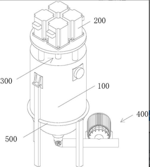 本实用新型公开了一种液态肥半成品研磨系统,涉及液态肥生产技术领域。本实用新型包括研磨仓、动力电机、研磨装置、排料装置和固定支架,研磨仓上方固定连接有四台动力电机,每台动力电机下方固定连接有一个研磨装置,研磨仓底部固定连接有排料装置,研磨仓外部固定连接有固定支架。本实用新型通过设置研磨仓、支架连接块、动力电机、电机转轴、研磨装置、研磨转轴、研磨刀片、固定支架、第一支架腿和第二支架腿,解决了现有的液态肥半成品研磨系统对液态肥半成品研磨强度不够,不能够进行充分的研磨,导致其效率较低;液态肥半成品研磨系统稳定性不强,不能保证装置的稳定工作,给工作带来很大的安全隐患的问题。