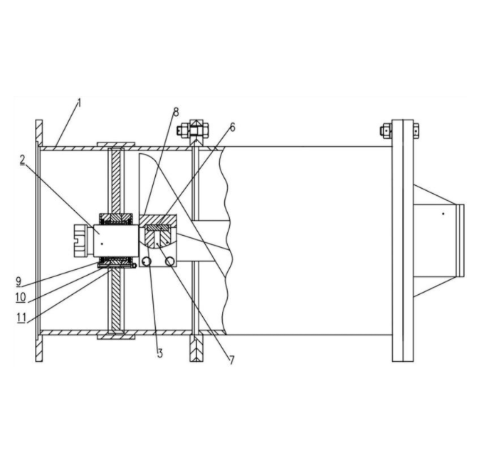 本实用新型公开了一种螺旋体联接轴装置,属于联接轴技术领域。装置包括设置在输送机壳体内的联接轴和螺旋体,联接轴的一端外侧壁相对设有两个半圆槽,联接轴一端的端部且位于两个半圆槽之间开设有一字槽,两个半圆槽内设有半圆键,一字槽内设有一字键,一字键的两端分别与两个半圆键抵接,联接轴设有半圆键的一端与螺旋体连接,且其外侧设有卡套。本实用新型的联接轴两端设置有半圆槽和一字槽,并通过半圆键和一字键与螺旋体连接,增大联接强度,减少联接轴的轴头崩裂,增长联接轴的使用寿命。