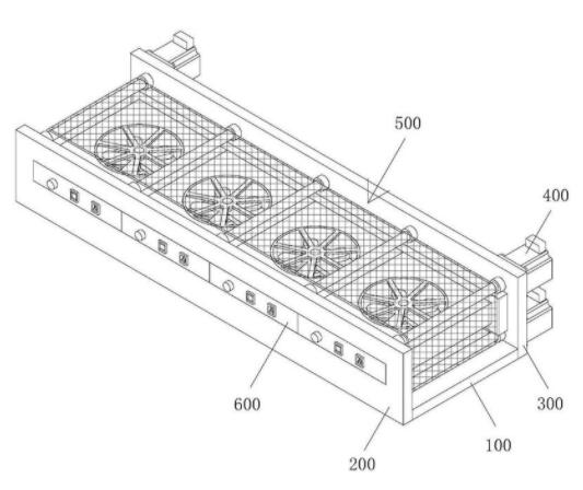 本实用新型公开了一种液态肥冷风吹干传送系统,涉及液态肥生产技术领域。本实用新型包括固定底座、前支架板、伺服电机、传送装置和冷风装置,固定底座前方固定连接有前支架板,固定底座后方固定连接有后支架板,后支架板后方固定连接有四台伺服电机,前支架板和后支架板之间转动连接有传送装置,前支架板和后支架板之间固定连接有四台冷风装置。本实用新型通过设置伺服电机、电机转轴、传送装置、冷风装置、电源接口、开关按钮、调节转轴和风扇。本实用新型能对液态肥在装袋后进行传送冷风吹干并除去残留液,解决了传送与吹干分为两部分使工作效率较低;液态肥传送系统传送速率较慢,不能够高效传送袋装液态肥的问题。