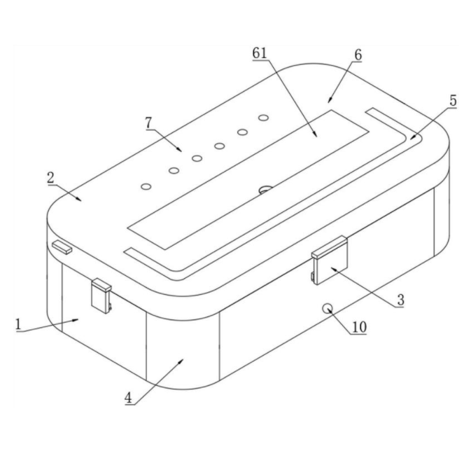 本实用新型公开了一种装修工人用便携式饭盒,涉及便携饭盒技术领域,包括盒体,盒体内部设置有餐盒,餐盒的内部通过隔板被分隔成若干个空间,盒体通过卡扣卡设有与之向匹配的盒盖,盒盖的顶部开设有若干透气孔,盒体的盒壁开设有储水腔,盒体内设置有加热机构和清洁机构;清洁机构包括开设在盒体上的进水口,盒体的外壁底部固定开设有出水口。其好处在于,通过设置清洁机构,通过盒体的盒壁中开设的储水槽,盒体上开设有进水口和出水口且进水口与出水口均有与之相匹配的堵块,将水从水口灌入储水槽中,然后在使用时,将出水口上的堵块拿出,储水腔中的水会通过出水口流出,可以对装修师傅的手掌进行清洁的作用。