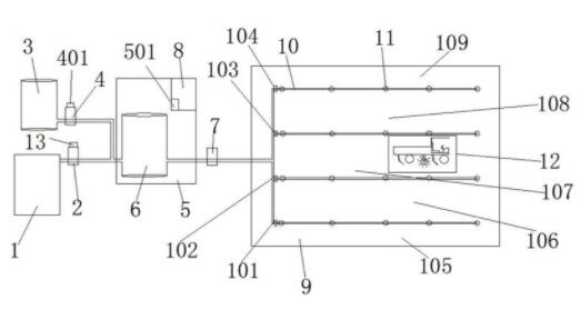 本实用新型公开了,包括集水池、抽水装置、药剂添加桶、药剂输送装置、中控装置、泵送装置、喷灌装置、药剂混合车;所述集水池、药剂添加桶并联后与设于中控装置上的药剂混合桶连通;药剂混合桶另一端还与多根农田管道连通,药剂混合桶与农田管道之间设有泵送装置;农田管道上设有喷灌装置;中控装置上设有控制平台;所述多根农田管道铺设于重金属污染农田上,在重金属污染农田上还设有药剂混合车。本实用新型可规模化、同时修复大面积农田,只需一名工作人员即可完成所有的修复工作以及农田翻耕,无需将污染土壤搬运至其他地方进行修复,节约人力物力,操作简单方便,工作效率高,具有良好的应用前景。