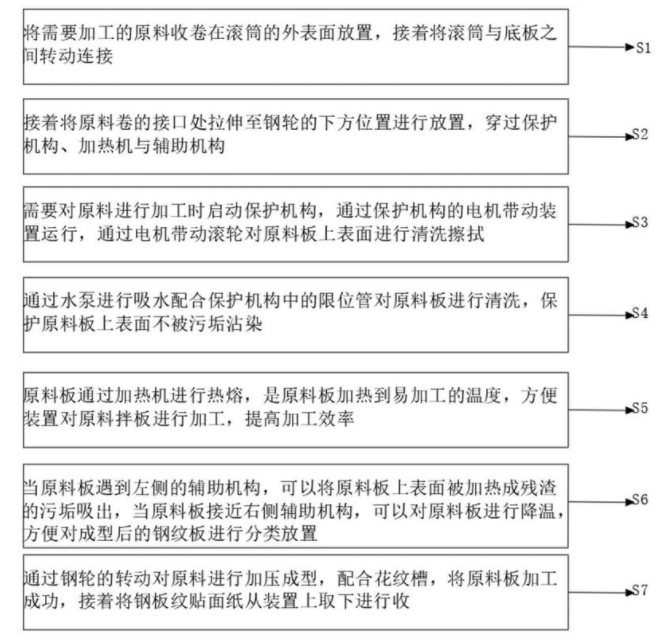 本发明公开了一种同步钢板纹贴面纸的制备方法,涉及钢板纹贴面纸技术领域,包括以下加工步骤,S1:将需要加工的原料收卷在滚筒的外表面放置,接着将滚筒与底板之间转动连接,S2:接着将原料卷的接口处拉伸至钢轮的下方位置进行放置,穿过保护机构、加热机与辅助机构,S3:需要对原料进行加工时启动保护机构,S4:通过水泵进行吸水配合保护机构中的限位管对原料板进行清洗,S5:原料板通过加热机进行热熔,S6:当原料板遇到左侧的辅助机构,可以将原料板上表面被加热成残渣的污垢吸出,当原料板接近右侧辅助机构,可以对原料板进行降温,S7:通过钢轮的转动对原料进行加压成型,配合花纹槽,将原料板加工成功。