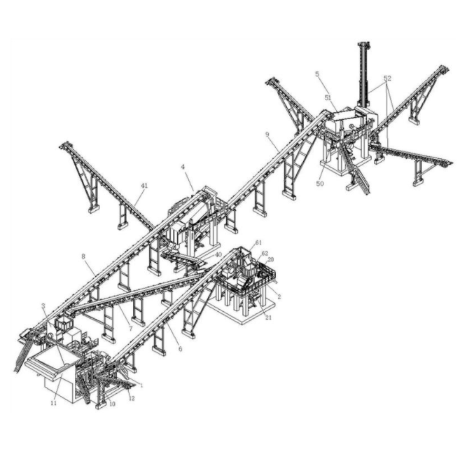 本发明公开了一种积料式破碎与筛分生产线及筛分方法,包括第一破碎筛分机组、第二破碎筛分机组、第三破碎筛分机组、第一筛分机组和第二筛分机组,在第一破碎筛分机组的输出口下方设与第二破碎筛分机组的入口上方之间置有第一输送带,在第二破碎筛分机组与第三破碎筛分机组之间设置有第二输送带,在第三破碎筛分机组与第一筛分机组之间设置有第三输送带,第一筛分机组与第五破碎筛分机组之间设置有第四皮带输送带;石料由第一破碎筛分机组内进行首次破碎和初次破碎后依次输送至第二破碎筛分机组、第三破碎筛分机组破碎筛分;再依次送入第一筛分机组和第二筛分机组进行筛分,实现给料、预筛、粗碎、中碎、细碎、筛分、输送的功能。