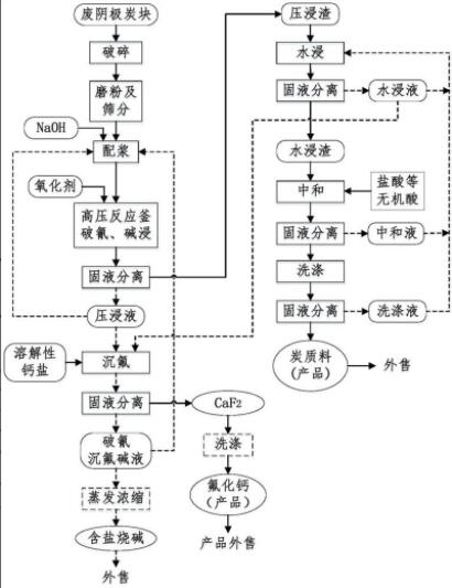 本实用新型公开了一种铝电解槽废阴极炭块处理系统,属于铝电解大修渣处理领域。该处理系统包括破碎研磨模块、压力浸出过滤模块、沉氟及碱回收模块、水浸过滤模块、中和过滤模块、洗涤过滤模块和集烟模块,破碎研磨模块、压力浸出过滤模块、沉氟及碱回收模块、水浸过滤模块、中和过滤模块、洗涤过滤模块依次连接,破碎研磨模块、压力浸出过滤模块、沉氟及碱回收模块、水浸过滤模块、中和过滤模块、洗涤过滤模块均与集烟模块连接。本实用新型不仅可避免铝电解槽废阴极炭块对环境的危害,而且能实现废阴极炭块的资源化利用。