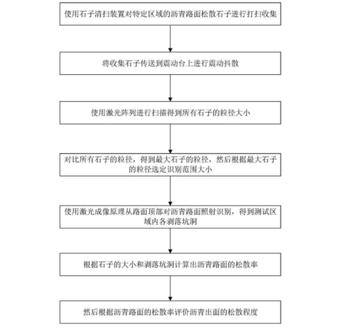 本发明提供沥青路面松散评价方法,属于沥青路面松散评价技术领域,使用集料清扫装置对特定区域的沥青路面松散集料进行打扫收集,将收集集料传送到震动台上进行震动抖散,使用激光阵列进行扫描得到所有集料的粒径大小,对比所有集料的粒径,得到最大集料的粒径,然后根据最大集料的粒径选定识别范围大小,使用激光成像原理从路面顶部对沥青路面照射识别,得到测试区域内各剥落坑洞,根据集料的大小和剥落坑洞计算出沥青路面的松散率,后根据松散率评价沥青出面的松散程度。收集散落的集料进行检测分组,以集料的粒径为基准测量范围参考值,实现对剥落坑洞面积更加的精准,在整个测量过程中不涉及到切割路面或者挖掘等程序,很好的保护道路。