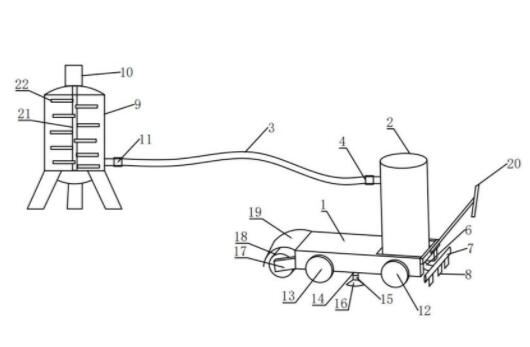 本实用新型公开了一种灌注式路面高效自动灌浆装置,自动灌浆装置包括底座,底座的前端开设有U型凹口,U型凹口上安装有灌浆机构,灌浆机构通过导通管连接有搅拌机构,底座的前端下侧设有驱动轮,驱动轮上设有驱动机构,底座的后端下侧设有从动轮,底座的中部下侧且位于驱动轮与从动轮之间设有抹浆机构,抹浆机构设为多个,多个抹浆机构沿底座的宽度方向间隔设置,底座的后侧设有刮浆机构,底座内部设有PLC控制器,灌浆机构、搅拌机构、驱动机构、抹浆机构和刮浆机构均与PLC控制器连接。本实用新型自动化程度高,可实现自动灌浆和刮浆操作,无需人工参与,工艺简便,施工效率高。