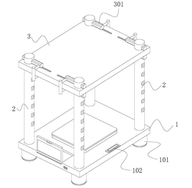 本实用新型涉及一种千斤顶的计量校准装置,涉及千斤顶校准技术领域。本实用新型包括支撑架、支撑杆和顶板,支撑架底端旋接有调平螺纹管,支撑架上侧前端卡接固定有水平仪,支撑架上侧一端转动卡接有显示器,支撑架上侧四周旋接固定有支撑杆,支撑杆外周面一端自上而下贯穿开设有定位孔,支撑杆上端卡接有顶板,顶板两端滑动卡接有定位杆。本实用新型通过支撑架、支撑杆和顶板,解决了现有的千斤顶占用空间较大,运输和收纳较为不便,使用的灵活性较低,无法进行水平调节,校准结果精度不高的问题。