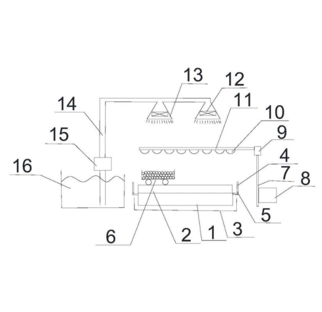 本发明提供模拟雨水环境的道路材料有害组分浸出装置及其浸出方法,属于道路材料有害组分浸出技术领域,包括基底、道路材料层、浸水收集槽、车辆辊压模拟装置、竖直支撑杆、控制装置、旋转电机、太阳光模拟灯、模拟灯支撑横杆和雨水模拟装置。本发明通过设置车辆辊压模拟装置进行模拟车辆的辊压,然后太阳光模拟灯模拟太阳光进行照射,对道路材料层加热和紫外线辐射,再通过雨水模拟装置模拟不同的下雨程度,可以在短时间内模拟了实际环境的天气变化没更加贴近实际,使得浸出的物质更与实际的使用贴近,更佳精准。