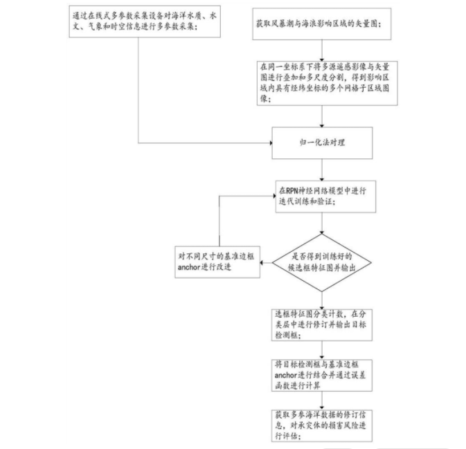 本发明公开了一种风暴潮风险评估与减灾方法,通过在线式多参数采集设备对海洋水质、水文、气象和时空信息进行多参数采集,对采集的多参海洋数据进行网格化存储;选取易受海洋风暴潮与海浪影响的地物类别进行地物信息提取,获取风暴潮与海浪影响区域的矢量图;将风暴潮与海浪影响区域的多源遥感影像与矢量图导入网格化存储模型中,在同一坐标系下将多源遥感影像与矢量图进行叠加,然后根据预设的网格分辨率进行多尺度分割,得到影响区域内具有经纬坐标的多个网格子区域图像;采用归一化法对理多参海洋数据与网格子区域图像进行预处理,在RPN神经网络模型中进行迭代训练和验证。本发明实现了风暴潮风高效评估台与精细化预警,减少了预测误差。
