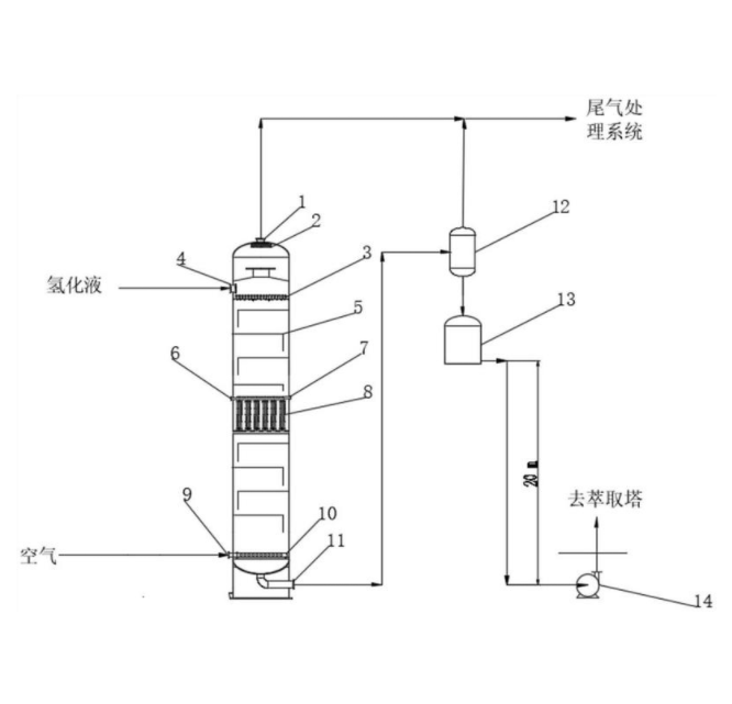 本实用新型公开了一种蒽醌法制双氧水氧化系统。系统包括氧化塔,氧化塔的顶部设有氧化尾气出口,氧化塔的底部设有氧化液出口,氧化液出口连接有气液分离器,气液分离器顶部设有气相出口,气液分离器底部设有液相出口,液相出口连接有氧化液储槽,氧化液储槽通过氧化液泵连接有萃取塔。本实用新型利用气液两相逆流的方式有利于提高氧化收率、减少副反应,保证了产品的质量;且位于高位的气液分离器,有利于减缓大流量氧化液的冲击,从而保证了氧化液流量的安全调控;氧化液储槽与氧化液泵之间存在高位差,合理的利用这种高位差,减少了能耗。