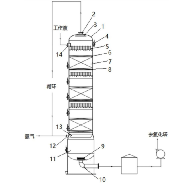 本实用新型公开了一种蒽醌法制备双氧水的氢化系统。系统包括氢化塔,氢化塔的上端设有出气管,氢化塔的下端设有出液管,氢化塔内从上往下依次设有三个触媒机构,位于最下方的触媒机构的下侧通过导流板连接有气液分离器,气液分离器的出料口与出液管连接,气液分离器的一侧连接有氢气进气管,氢化塔一侧且位于最上方的触媒机构的上方设有工作液进液管。本实用新型可根据工艺需要串联一节或两节,也可以同时串联三节使用,根据氢化效率及生产能力的要求而定自主调节,增强生产灵活性,通过塔内多层触媒反应,不仅可以达到较高氢效,而且能有效降低塔高,有助于提高产品浓度与装置规模,降低催化剂及蒽醌的消耗。