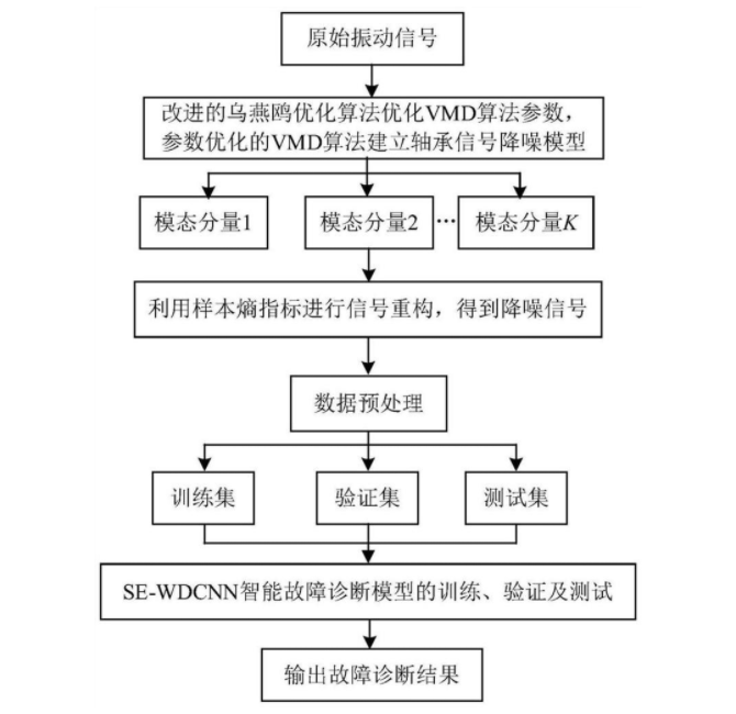 本发明公开了一种列车轴承故障智能诊断方法,包括如下步骤:设置列车轴承振动信号采集试验台的轴速和采样频率,并对列车不同轴承故障类型的原始振动信号进行采样;建立VMD算法的参数优化模型,利用改进的乌燕鸥优化算法对VMD算法的参数模态分量数K和惩罚因子α进行寻优;采用参数优化后的VMD算法建立轴承信号降噪模型,对列车轴承振动信号进行分解获得一系列固有模态分量:对降噪信号进行预处理、构建列车轴承故障诊断的SE?WDCNN模型以及SE?WDCNN模型的训练、验证与测试,最后将测试集输入已训练好的模型进行性能评估。本发明能对列车轴承振动信号进行降噪处理,自适应提取轴承振动信号的故障特征,有效提高识别精度和诊断速度。