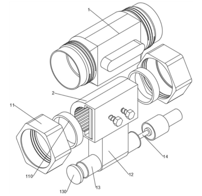 本实用新型涉及绝缘导线技术领域,具体地说,涉及一种绝缘导线智能多功能装置。其包括绝缘护罩和绝缘护罩内部的高导流导体,高导流导体内部左右滑动设有锁紧滑块,锁紧滑块外表面转动设有力矩螺丝,力矩螺丝端部螺纹伸出高导流导体内部,力矩螺丝靠近锁紧滑块的外壁设有齿轮盘,锁紧滑块表面开设有多个通孔,通孔内部通过支架转动设有吹风扇,吹风扇端部连接有联动盘,多个联动盘外壁与齿轮盘外壁啮合连接。本实用新型拧动力矩螺丝带动锁紧滑块滑动将导线固定,同时,使齿轮盘啮合带动多个联动盘转动,实现带动吹风扇转动吹动高导流导体内部的灰尘,将导线外壁的灰尘从高导流导体内部吹出,避免灰尘造成堵塞,方便清理。