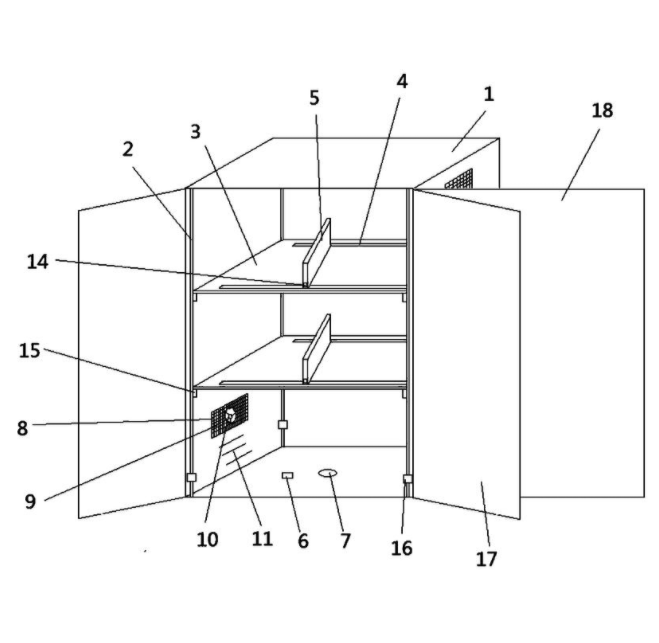 本实用新型公开一种可自动均衡温度和湿度的纸件档案存放柜,包括柜体,所述柜体内沿柜体高度方向上的四个边分别设有竖直导轨,所述竖直导轨之间水平设有多块隔板,所述隔板可沿竖直导轨上下滑动;所述每块隔板前后两端均设有水平滑轨,所述水平滑轨上设有滑板,所述滑板可沿水平滑轨左右滑动;所述柜体内底部设有温湿度传感器和防虫药袋;柜体一侧面下部设有进风口,所述进风口设有第一防尘网和风扇,所述第一防尘网安装在风扇之外,所述柜体内部、位于风扇下方设有电热丝;所述柜体另一侧面上部设有出风口,所述出风口上设有第二防尘网;所述温湿度传感器、风扇、电热丝分别与设于柜体外侧面的微处理器电连接。