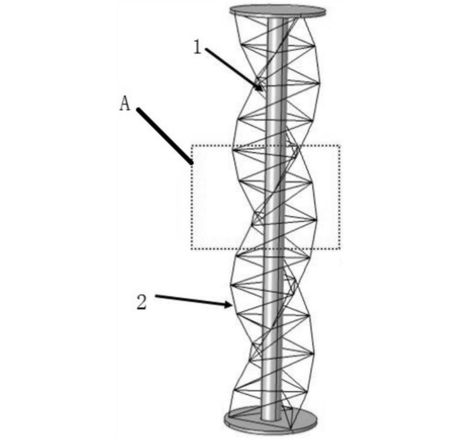 本实用新型提供一种基于张拉整体式结构的桥墩防车撞装置,属于桥墩防车撞技术领域,包括桥墩墩柱和张拉整体结构防撞护罩,张拉整体结构防撞护罩设置在桥墩墩柱的外侧,张拉整体结构防撞护罩包括若干个单级三棱柱张拉整体结构,单级三棱柱张拉整体结构与单级三棱柱张拉整体结构之间首尾连接。张拉整体结构是一种自应力、自平衡结构,对多级三棱柱张拉整体结构施加一定的预应力使其具有刚度,形成一定的结构构型,张拉整体结构能实现较好防撞效果和合理的造价,体现较高综合性,张拉整体结构对于小撞击和大撞击情况的缓冲效果都较好。