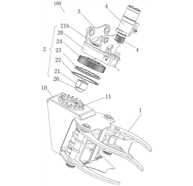本实用新型公开了一种带回转功能的树枝剪,包括连接于挖掘机的工作臂前端的树枝剪组件本体,该树枝剪组件本体包括树枝剪下身、回转支撑组件、马拉头和旋转马达,所述马拉头的下端固定连接在所述回转支撑组件的上端,所述树枝剪下身的头部水平连接在回转支撑组件的下端,所述旋转马达的固定端固定连接在马拉头的侧部,所述旋转马达的输出端与所述回转支撑组件侧部啮合传动连接,所述回转支撑组件包括回转支撑座、中央回转接头和回转支撑齿盘。本实用新的树枝剪能够进行回转,为此在树枝剪在修剪树枝时,使工作更加灵活方便,大大提高了树枝剪在修枝、剪树时的机械化作业水平,从而改善了树枝剪的工作效率。