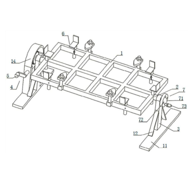 本发明提供一种施工升降机底笼门框与门配装测试装置及使用方法,属于升降机技术领域,包括翻转平台,所述翻转平台左右两侧均固定连接有连接轴,两侧的连接轴均通过轴承与立柱顶部转动连接,立柱对翻转平台起支撑作用,翻转平台左侧设有转动机构,转动机构包括涡轮和蜗杆,涡轮与连接轴远离翻转平台一端固定连接,蜗杆与涡轮啮合连接;翻转平台右侧设有用于防止翻转平台转动的限位组件。通过设置转动机构,旋转转动手柄带动蜗杆转动,由于蜗杆与涡轮啮合连接,所以带动翻转平台转动,从而方便对固定在翻转平台上表面的底笼门框和门进行测量,这样只需要将底笼门框和门一次吊装到翻转平台上即能完成检测,效率高,操作简易,过程简单,方便快捷。