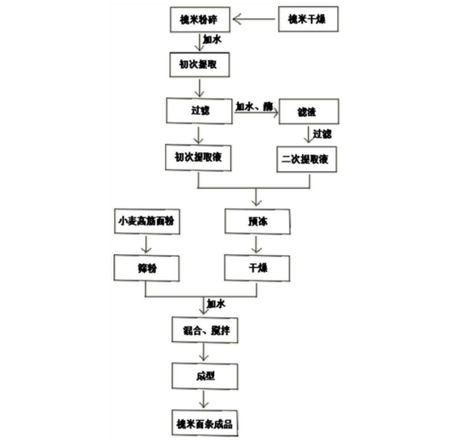本发明提供一种具有抗氧化功能的槐米面条制备方法,属于康养食品加工技术领域,槐米面条包括槐米1~12份、小麦高筋面粉100~400份和水400~500份;槐米面条制备方法包括以下步骤:按重量比例称取槐米、小麦高筋面粉和水,槐米进行干燥后粉碎至20目,按重量比例加入水中进行混合搅拌,高温提取槐米提取液,过滤得到提取初液和滤渣,滤渣中加入水、纤维素酶和果胶酶处理,过滤得到二次滤液,将提取初液和二次滤液混合放入冷冻室预冻,再放入干燥仓,开启真空泵进行干燥,得到槐米提取物,槐米提取物采取真空包装并冷藏,筛粉后的小麦高筋面粉与槐米提取物混合,加水进行搅拌均匀,置于面条机中持续搅拌成团,成型后出面,进行晾晒风干和分装,得到面条成品。