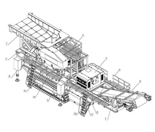 本实用新型公开了一种移动式颚破机,所述鄂破机包括前机架、后机架、履带行走总成、动力驱动总成、颚破主机、传送装置和下端支撑机架,下端支撑机架通过螺栓固定在履带行走总成上,后机架的底端可拆卸安装在下端支撑机架上,在前机架通过下端支撑机架固定安装在履带行走总成上,在后机架上固定安装颚破主机,在后机架上的后端固定安装有上料斗,该上料斗位于所述颚破主机的后上方,上料斗的出料口与颚破主机的入料口连通,在后机架的两端侧部固定安装有升降液压缸,传送装置的一端固定在颚破主机的出料口下方。本实用新型能有效避免拆装和运输损坏率,节省了转运成本和提升了转运安装的安全性,可以适应恶劣环境下破碎加工作业。