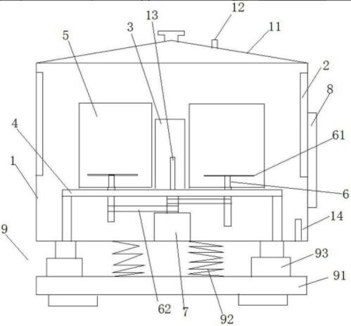 本实用新型涉及食品生产设备技术领域,特别涉及一种恒温恒湿的烘焙食品生产用发酵装置,包括壳体、加热板、加湿器、支撑台、发酵罐、搅拌装置、电机、控制器和缓冲装置,所述壳体为上部开口的圆型空心壳外壳,该壳体的上方开口设有壳盖,该壳盖上设有通气口,所述加热板设置在壳体的内侧壁上并与控制器连接,所述支撑台为支撑架起在壳体内部的平台,所述加湿器设置在支撑台上中部并与控制器连接,所述发酵罐固定在支撑台上,所述搅拌装置可转动地固定在发酵罐的底部,且该搅拌装置设置转轴穿透支撑台至底部,所述电机设置做支撑台的底部,所述电机与搅拌装置的转轴连接并带动转轴转动。该装置能保证面粉在恒温恒湿状态下进行发酵,且能够搅拌保证其发酵均匀,结构简单,便于操作。