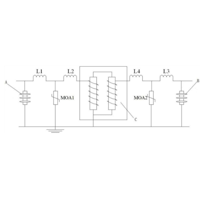 本实用新型公开了一种利用反冲消除变压器截波过电压的装置,属于防雷灭弧技术领域,包括高压侧灭弧装置、低压侧灭弧装置、变压器、电抗L1?L4、高压侧避雷器和低压侧避雷器,电抗L1和电抗L2串联设置并连接在变压器的高压侧,电抗L3和电抗L4串联设置并连接在变压器的低压侧,高压侧避雷器的一端连接在电抗L1和电抗L2之间。本实用新型通过安装反冲灭弧装置消除截波过电压,解决了由绕组间绝缘过电压闪络引发的变压器爆炸事故,提高了避雷器的生存能力和电力变压器的安全性,防雷的性价比提高,在发生恶性突变之前能够及时处理,维修成本降低,对电力变压器的保护程度提高,在电力变压器高低压侧分别安装反冲灭弧装置。