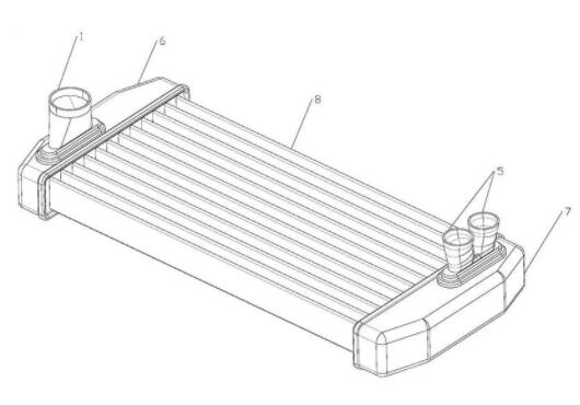 本实用新型公开了一种热交换器用缓流管道接头,为单口式管道接头或多口式管道接头。本实用新型还提供一种含有该接头的热交换器。本实用新型的多种管道接头可有效降低冷却液对热交换芯子的压力和冲击力,防止热交换器漏液后对硬件造成损伤,有效提高热交换器的换热效果,相对于现有技术,本实用新型提高了热交换器的安全性,且管道口径可大于水室宽度,避免常规的小管道口径?大水室宽度的热交换器中,水室宽度过大导致用水量大、整体尺寸大、流体涡流严重的问题。本实用新型结构简单,外形美观,质量轻,安装简单,使用时安静,降温稳定,对环境依赖小,散热效果明显,且使用寿命长。