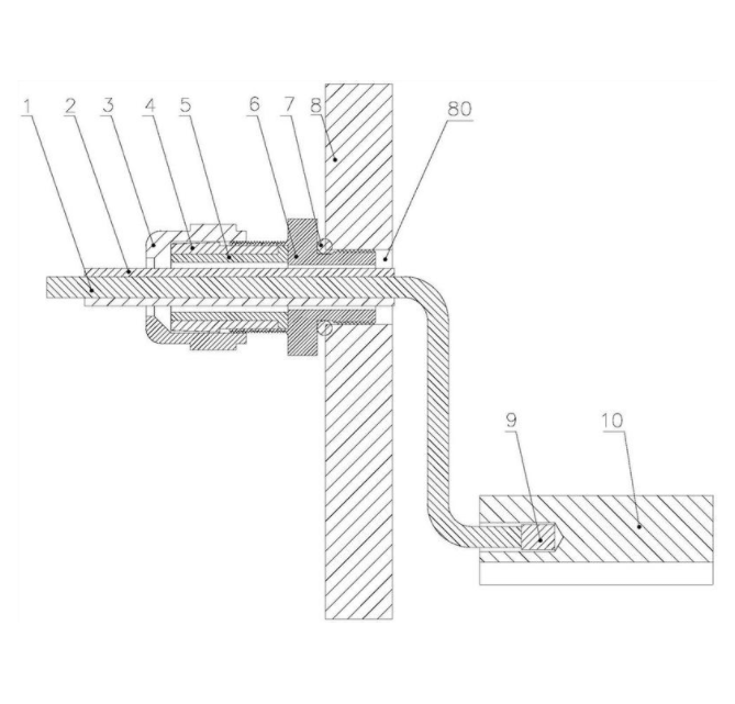 本实用新型公开了一种温度传感线的密封接头,包括设置于齿轮箱体侧壁上的传感线孔和设置在传感线孔内壁上的用于贯穿温度传感线的连接管头,该连接管头的内侧端连接在传感线孔内壁上,在连接管头的内侧一端外壁与齿轮箱体的传感线孔处设置有O型圈,在连接管头的外侧端连接有锁紧螺母,在温度传感线的外壁套设有热缩管,由温度传感线外壁向锁紧螺母的内壁方向依次套设有橡胶套和锥形橡胶爪,橡胶套套设在热缩管的外壁上,锥形橡胶爪的两端分别套设在橡胶套的外壁和连接管头外侧端的内壁上。本实用新型的密封接头保证了温度传感线引出时的密封可靠性,也保证了密封头对温度传感线的压紧力,可有效防止润滑油从齿轮箱体沿温度传感线的外壁漏出。