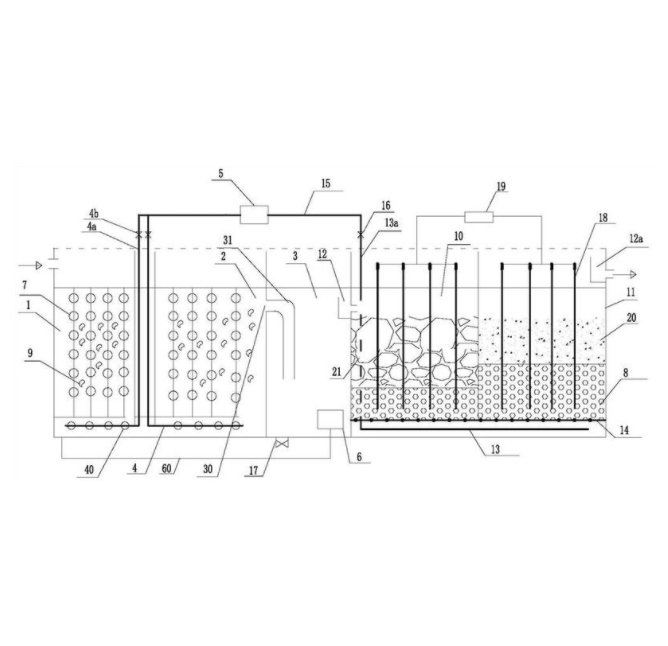 本实用新型公开了一种基于AO?MBBR?电感耦合滤池的污水处理系统,所述处理系统包括缺氧池、好氧池、沉淀池、恒压直流电源和一级或多级电感耦合滤池;所述缺氧池的底部与好氧池的底部相互连通,所述好氧池的顶端侧壁与沉淀池连通,所述沉淀池的顶端侧壁与所述电感耦合滤池连通,在电感耦合滤池内布设有电极矩阵,所述恒压直流电源与电极矩阵电气连接,在电感耦合滤池的底部设有第二曝气支管道,在接近第二曝气支管道上方的电感耦合滤池内水平设置有穿孔挡板,所述电感耦合滤池与缺氧池和好氧池之间设置有相互连通的曝气主管。本实用新型将AO、MBBR与电感耦合滤池技术相结合对污水中的污染物处,能有效去除生活污水中氮、磷和有机物并可达到标准排放。