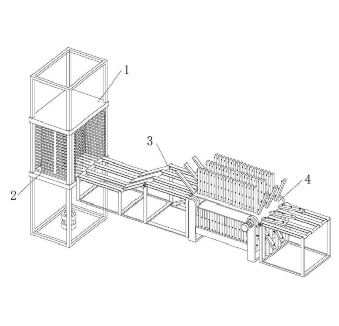 本实用新型公开了一种自动进板装置,涉及机械加工技术领域。本实用新型包括进板组件、进板架、第一传送组件和整理组件,进板组件底端设置有气缸,进板组件内侧卡接有进板架,进板架一侧卡接有伸缩杆,进板组件一侧设置有第一传送组件,第一传送组件一端设置有第二传送组件,第一传送组件和第二传送组件之间设置有整理组件,整理组件外表面卡接固定有支撑板。本实用新型通过进板组件、进板架、第一传送组件和整理组件,解决了现有的进板装置仍需要工作人员将胶合板插入进板装置内,自动化程度不高,生产效率受到限制,一台热压机需要设置两个进板装置,成本较高,厂房内空间利用率较低的问题。