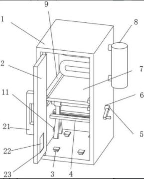 本实用新型涉及一种面团发酵装置,具体为一种具有冷冻功能的烘焙食品用面团发酵装置。本实用新型包括装置主体,装置主体内部的前侧面和后侧面的底侧固定有限位块,限位块的顶端安装有C形固定件,C形固定件中间设有隔板,装置主体的后侧面靠近中间位置开设有通孔,装置主体内部设有挤压装置,挤压装置包括丝杆,丝杆的后端贯穿通孔并延伸至装置主体外部,丝杆的后侧通过插接固定有横板,横板后端面的左侧设有摇把,丝杆的表面设有两个套筒,套筒的底端安装有Y形块,装置主体的内部设有固定块,隔板的底端设有连接块,连接块的底端设有冷关灯,本实用新型降低了面团发酵的难度,同时使发酵后面团制作成的烘焙食品的口感的到提升。