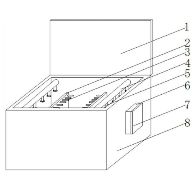 本实用新型公开了一种中空玻璃高温湿试验箱,包括箱体,所述箱体靠近顶端的内壁皆设置有导水管,所述导水管的底部皆设置有喷嘴,所述导水管之间皆对应设置有挂板,所述挂板相对的一侧表面皆设置有挂针,所述箱体的一侧表面设置有引流管,所述引流管的一侧通过管道设置有抽水泵,所述箱体的两侧表面皆设置有加热组件。该一种中空玻璃高温湿试验箱,在进行日常使用的过程中,可通过温湿度控制器连接温湿度传感器对箱体内部进行温湿度的实时监测,然后通过温湿度控制器进行实时分析判断,并且根据设定的试验值控制抽水泵和热风机进行实时运行对内部温湿度调节,使试验的整体环境更加适宜符合标准,使得试验的整体精确性和可靠性更高。