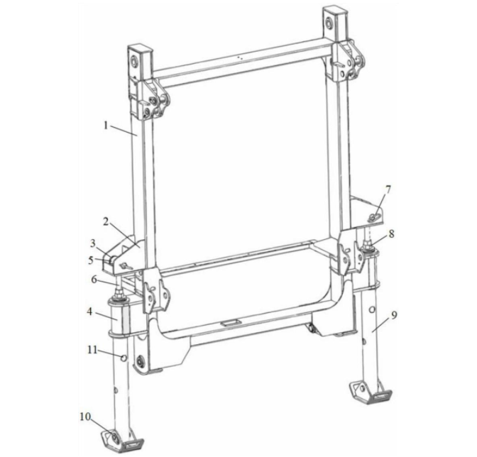 本实用新型公开了一种移动破碎站用工作支撑机构,属于支撑机构技术领域。支撑机构包括立架组件,立架组件的底部两侧均设有调节组件,每个调节组件与立架组件连接,每个调节组件的下方设有支腿组件,支腿组件的上端与调节组件的下端抵接。本实用新型通过利用方便拆装的支撑机构为移动破碎站的前端模块提供可调节支撑,避免工作时间长,出现机体疲劳,对车架造成损伤,而且在野外工作时,方便展开和收起。