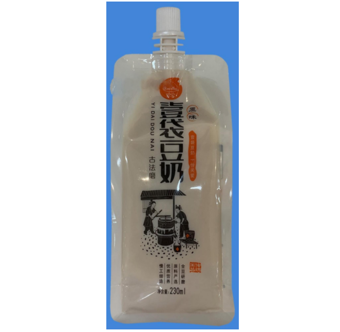 1.本外观设计产品的名称:包装袋(壹袋豆奶)。2.本外观设计产品的用途:本外观设计产品用于产品的包装。3.本外观设计产品的设计要点:在于形状与图案的结合。4.最能表明设计要点的图片或照片:主视图。5.请求保护的外观设计包含色彩。6.包装袋为透明材质,内饰物不属于请求保护范围。