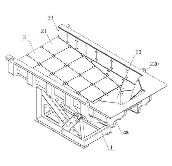 本实用新型公开了一种固定式给料装置,包括承载支架和给料斗,所述给料斗交接固定在承载支架上,所述给料斗呈槽状,该给料斗的前端和上端为开口状态,所述给料斗的后端底部与侧部沿给料斗的中心收缩,在给料斗的后端底部设有出料口,所述给料斗由前端至后端底部的出料口呈逐渐倾斜状态设置,在所述给料斗内的底部和侧部设置有耐磨板,该耐磨板由若干块焊达钢板紧贴分布在给料斗内的底部和侧部上,在所述出料口的外壁边缘设置有出料挡板。本实用新型的给料装置能有效改善了给料装置安装的稳定性和可靠性,供料快速简便,吊运和调节安装也必较方便,不仅可以承载、积累一定高度的砂石物料,也可以保护给料装置不受磨损,延长了使用寿命。