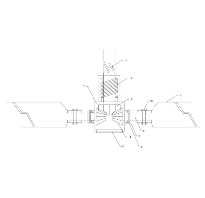 本实用新型公开了一种节能搅拌装置,包括搅拌器主轴、复位弹簧、主轴斜齿轮、叶片轴斜齿轮、搅拌叶片、叶片轴和轴头座,所述主轴斜齿轮固定在搅拌器主轴的下端,所述复位弹簧缠绕在搅拌器主轴上并位于主轴斜齿轮的上方,且复位弹簧的上端固定在搅拌器主轴上,复位弹簧的下端固定在主轴斜齿轮上,所述主轴斜齿轮和叶片轴斜齿轮均位于轴头座中且主轴斜齿轮和叶片轴斜齿轮适配靠接,该叶片轴与叶片轴斜齿轮固定连接并延伸至轴头座外,所述搅拌叶片固定在叶片轴上。本实用新型在搅拌过程中可降低高密度或高粘度物料对启动电机的负荷,降低设备损耗,能够根据物料状态调节桨叶的变化,保证电机的正常运行。