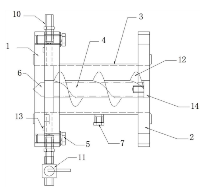 本实用新型公开了一种高粘度液体管道混合器,包括前密封端盖、后密封端盖、混合筒和混合螺旋套,该前密封端盖和后密封端盖平行设置并分别固定在混合筒的前后端,该前密封端盖和后密封端盖上均设有安装螺栓且中心处设有盖板,所述后密封端盖上设有固定螺栓,所述混合螺旋套可拆卸固定在固定螺栓上,该混合螺旋套位于混合筒的中部并延伸至混合筒前端端头处,该混合螺旋套的前端固定设有导流头,所述混合筒为中空圆筒,该混合筒的中部设有取样口。本实用新通过螺旋套将流入的物料进行分配至各个通孔流入后,通过导流头锥形的变化改变管道内物料流速,进入混合器内的流速提升,保证物料挤压混合的效果。