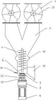 本实用新型公开了一种粉料配比混合器,包括卸料阀、Y型料斗、输送轴、机座、减速机和变频电机,所述卸料阀设置在Y型料斗的上方两个端部,该Y型料斗的底部侧边设有出料口,所述输送轴位于Y型料斗的下部,该输送轴的底部延伸至Y型料斗下方连接变频电机,在变频电机和Y型料斗之间由上往下依次设有防护套、轴承座、机座和减速机,所述机座内设有联轴器,所述输送轴的下部依次穿透防护套、轴承座和机座与减速机连接,该减速机的下端连接变频电机。本实用新的型粉料配比混合器,能够根据配比量对卸料阀进行变频控制,保证两种物料达到配比投放。