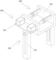 本实用新型公开了一种双螺杆塑料拉条装置,涉及工业生产技术领域。本实用新型包括支撑机构、固定机构和两个转动机构,支撑机构包括两个支撑腿和支撑架,固定机构包括固定架,固定架的横截面为U形,且固定架两侧内壁关于其竖直中线对称开设有四个放置槽。本实用新型通过移动支撑架在卡接槽内部滑动至合适位置,带动第一螺杆和第一螺纹环在滑槽内部滑动至合适位置,通过移动第二螺杆带动第二圆环沿着转动轴移动至合适位置,然后通过第二螺纹环对其进行固定,通过转动轴转动带动第一圆环转动,同时通过固定杆和限位块与限位槽配合使用,可以对其拉条高度进行调节,在拉条过程中提高拉条的稳定性。