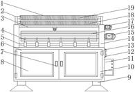 本实用新型公开了一种包装盒自动涂胶装置,包括柜体,所述柜体的内部和表面设置有储物支撑组件,所述柜体的顶部两侧皆固定安装有立板,所述立板之间固定安装有限位杆,所述限位杆的表面横向排布固定安装有限位头,所述限位头上方的立板之间转动安装有传送辊,所述传送辊的一端贯穿立板固定安装有传动电机,所述传送辊的上方设置有驱动调节组件。该一种包装盒自动涂胶装置,在进行日常使用的过程中,可通过传动电机带动传送辊进行实时转动输送上料,通过第一导向辊和第二导向辊进行上料的支撑和导向,通过限位杆和限位头进行抵触限位,实现自动上料传输代替了人工操作,节省了人力物力提高了涂胶的整体效率。
